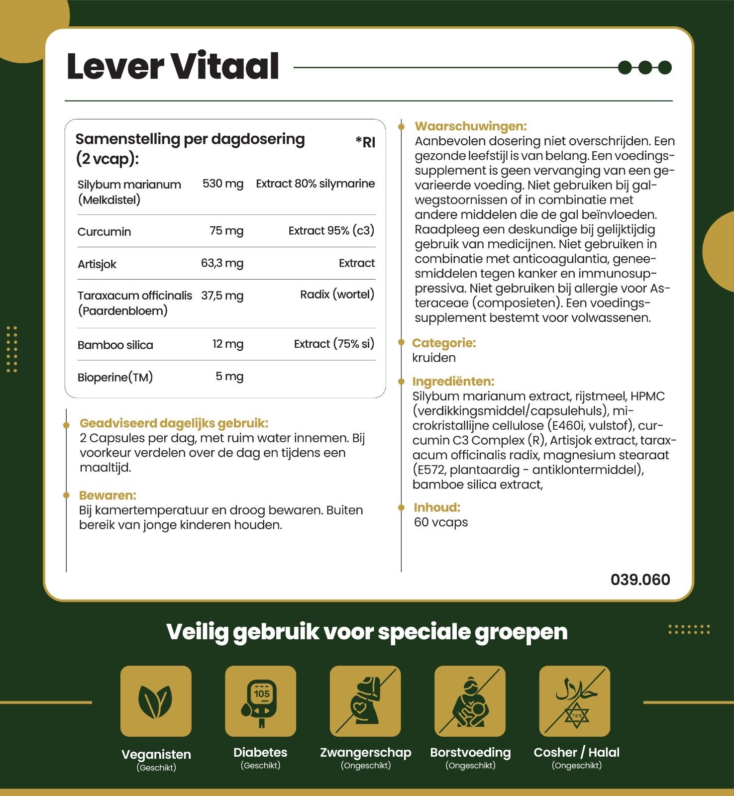Niet gebruiken bij galwegstoornissen of in combinatie met andere middelen die de gal beïnvloeden Raadpleeg een deskundige bij gelijktijdig gebruik van medicijnen. Niet gebruiken in combinatie met anticoagulantia, geneesmiddelen tegen kanker en immunosuppressiva. Niet gebruiken bij allergie voor Asteraceae (composieten). Een voedingssupplement bestemt voor volwassenen.